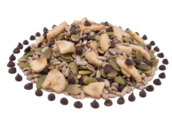ULTIMATE ICE-CREAM/YOGURT TOPPER – The mix has simple & clean ingredients list; pumpkin & sunflower seeds, mini dark chocolate and sweetened banana chips but a powerful flavor profile. The nutty balance of the seeds compliments the banana dark chocolate in way like no other snack mix we offer! This snack is perfect for the car to get you thru in-between times; but we highly recommend adding it to some plain Greek yogurt, cottage cheese, or vanilla yogurt!