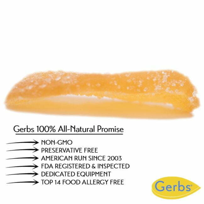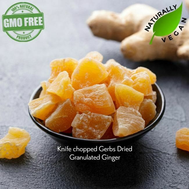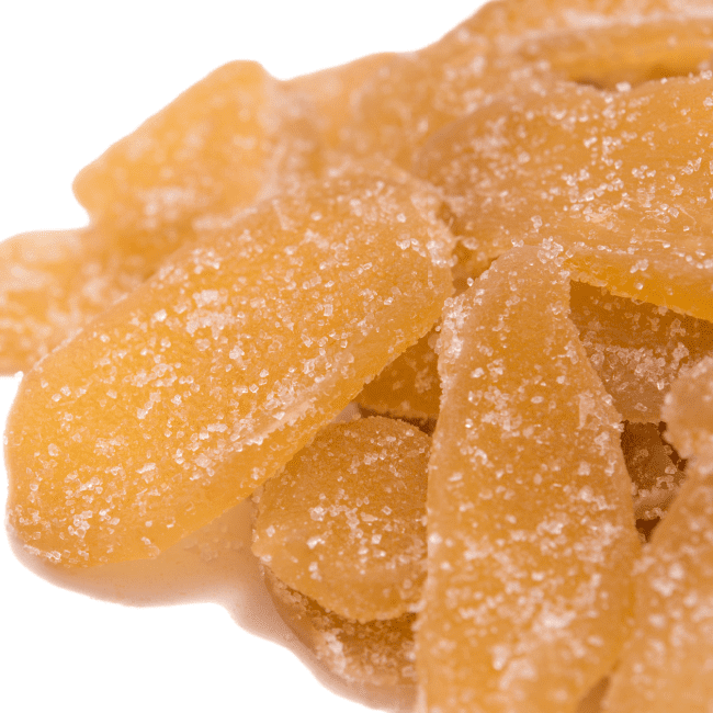 TASTY CRYSTALLIZED GINGER SLICES. Not-too-strong dried ginger root that has been preserved with a sugar coating. Helpful for your digestion, breath and putting a smile on your face. Unsulphured (sulfur dioxide has been identified as a key problematic substance involved with allergic reaction to sulfite in foods), and contains no added preservatives.