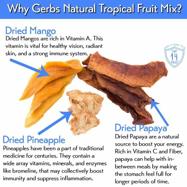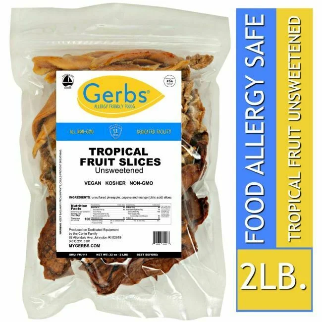TROPICAL NO SUGAR ADDED GOODNESS! Three flavors, all soft & chewy + lots of health benefits. Unsulfured (sulfur dioxide has been identified as a key problematic substance involved with allergic reaction to sulfite in foods), and contains no added preservatives. Dried through the nutrient-saving evaporation process.