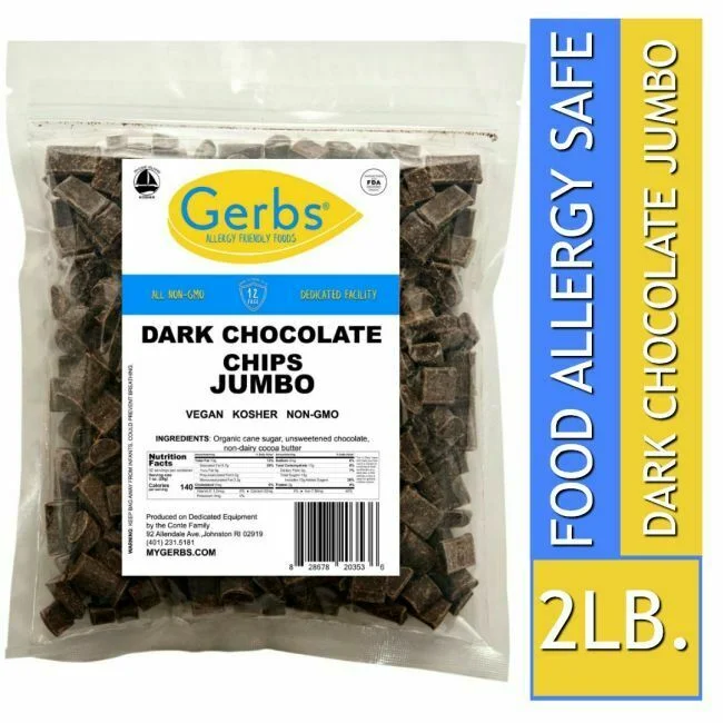 FABULOUS FOR BAKING! This non-dairy jumbo (rectangular) dark chocolate chip is semi sweet has more cacao (the beans that chocolate is made from) and less sugar than other chocolates, so it’s considered healthier than milk and white chocolate. The semi sweet cacao gives these jumbo dark chocolate chips chunks a complex flavor. Compared to green tea, red wine, and many fruits and vegetables ounce for ounce, the cocoa in dark chocolate chips has greater flavonoid content.