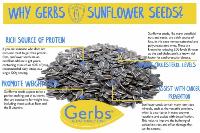 CRUNCHY SUN POWER. From the beautiful sunflower, nature provides these remarkable nutritionally complex seeds. Appease your hunger with our raw non GMO, naturally gluten-free Sunflower Seeds. Lots of Vitamin E, and helps lower your Cholesterol too. Read more about Sunflower Seeds below.