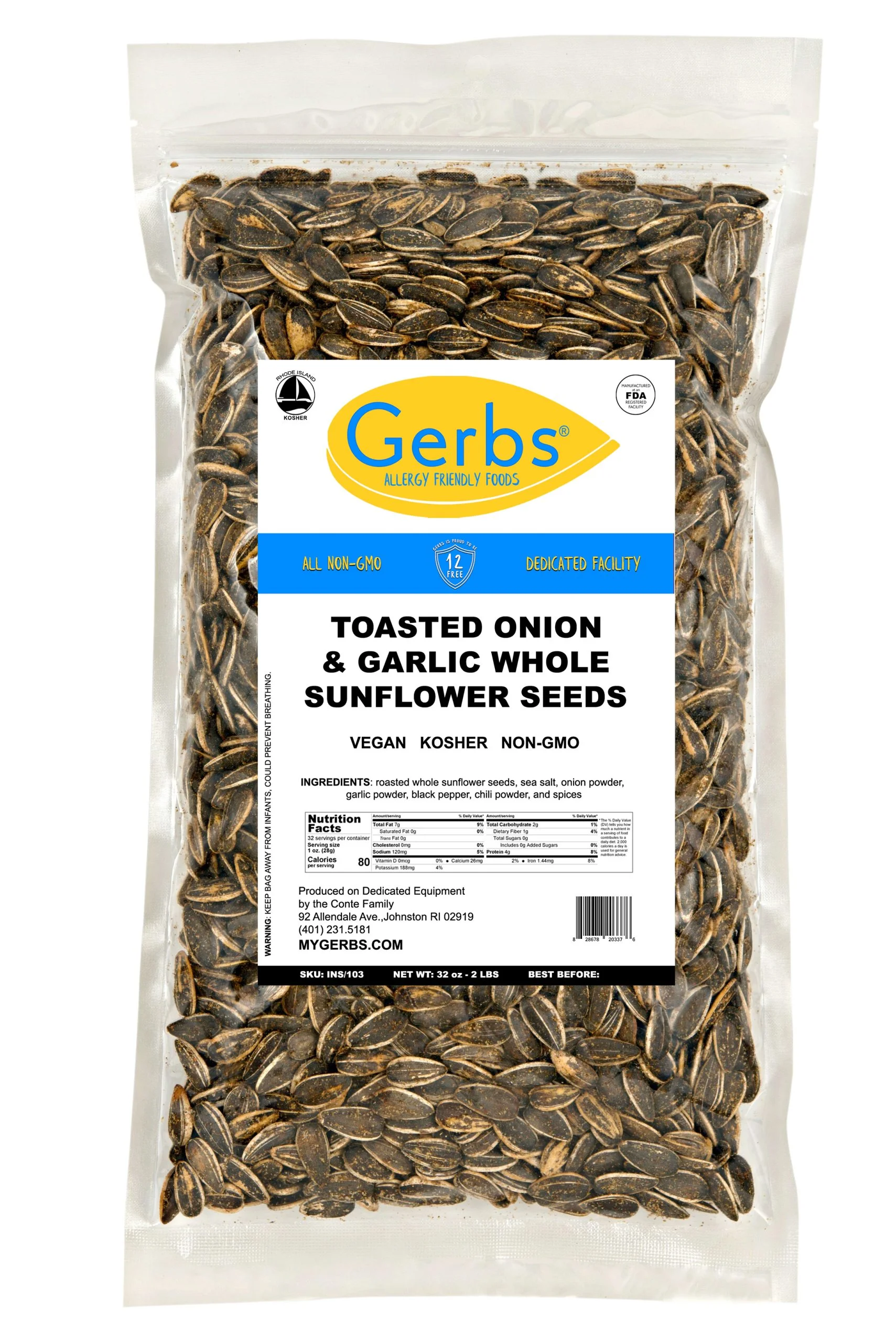 TOASTED ONION & GARLIC. A crunchy, flavorful, mildly spicy snack. Naturally gluten-free, GMO-free, and contains all essential amino acids, making it a complete protein source. These seasoned, dry roasted allergy friendly sunflower seeds have strong, distinctive flavors including chili powder, and black pepper making them an excellent party snack.