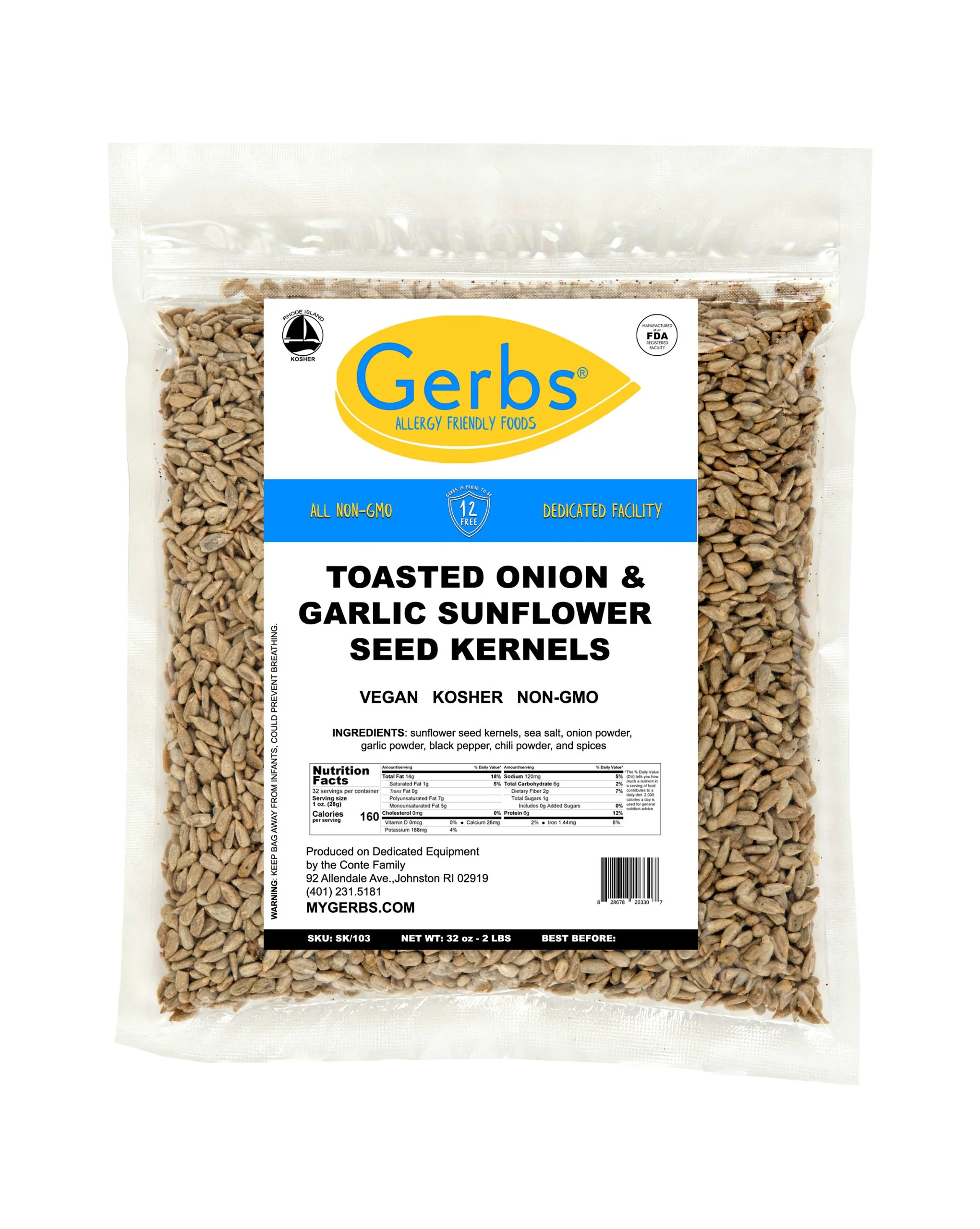 TOASTED ONION & GARLIC. A crunchy, flavorful, mildly spicy snack. Naturally gluten-free, GMO-free, and contains all essential amino acids, making it a complete protein source. These seasoned, dry roasted allergy friendly sunflower seeds have strong, distinctive flavors including chili powder, and black pepper making them an excellent party snack.