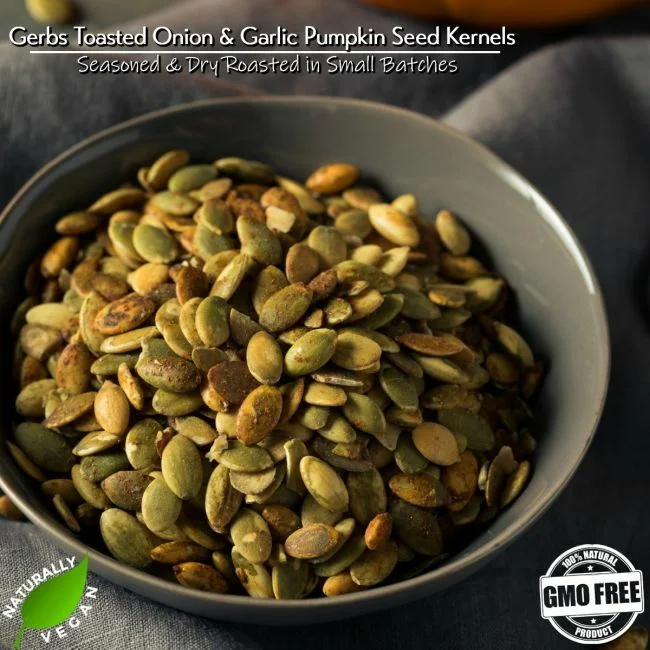 TOASTED ONION & GARLIC. A crunchy, flavorful, mildly spicy snack. Naturally gluten-free, GMO-free, and contains all essential amino acids, making it a complete protein source. These seasoned, dry roasted allergy friendly pumpkin seeds have strong, distinctive flavors including chili powder, and black pepper making them an excellent party snack.